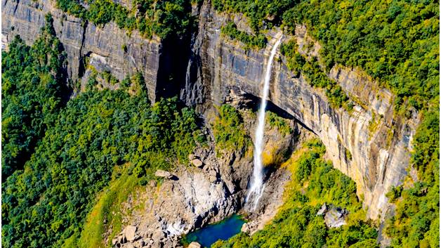 Nohkalikai Falls: This waterfall is located 4 kms from Cherrapunjee and is between 1500 and 2000 feet tall, making it the fourth longest fall in the world. It has a tragic legend associated with its name. A woman named Ka Likai had an illegitimate child. Her jealous husband killed their daughter, cooked her, and served her to Ka Likai. After discovering the truth, she killed her husband and jumped off the cliff, leading to the waterfall's name, Fall of Ka Likai.