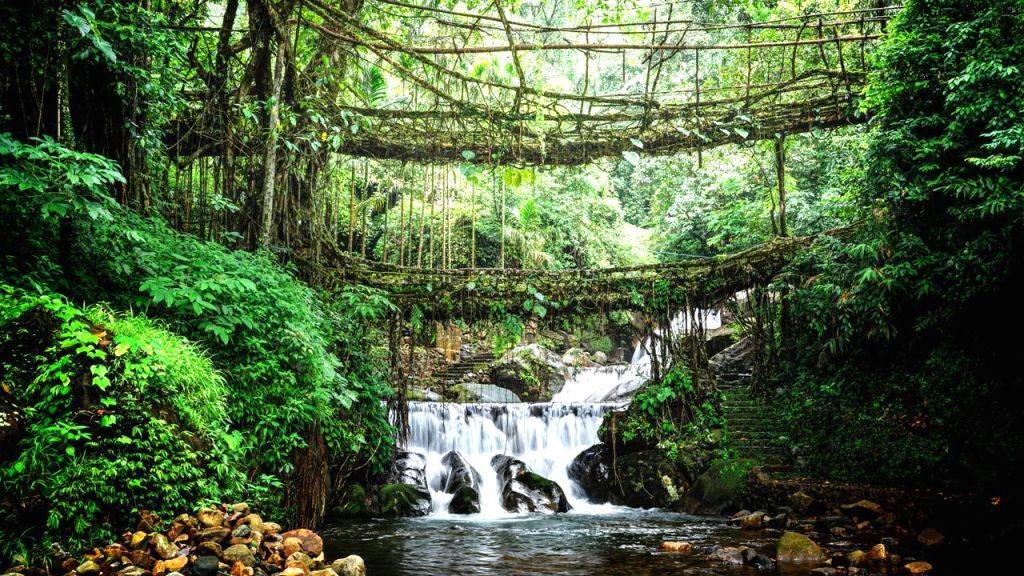Living Root Bridge: Witness the unique Living Root Bridge, an incredible example of bioengineering crafted by the Khasi and Jaiñtia tribes. Made from the roots of the Ficus elastic tree, these natural bridges are centuries old and represent harmony between humans and nature.