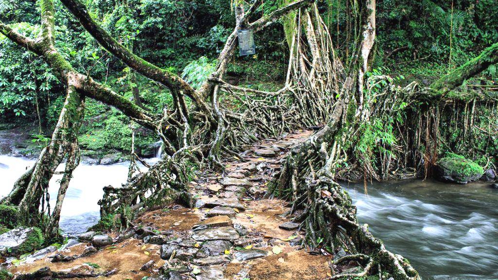 Living Root Bridge: A monumental bridge made of living roots. Living root bridges, tree-shaped structures using ficus plant roots, are common in Meghalaya, India, and handmade by Khasi and Jaiñtia peoples in the Shillong Plateau mountainous region. 75 were discovered in 2017 and found in Nagaland, Indonesia, and Java.