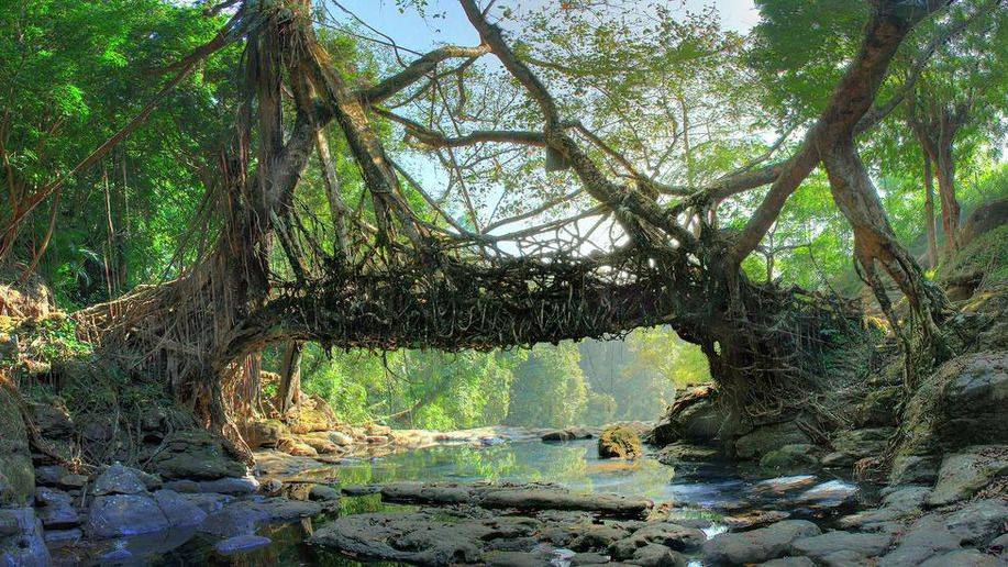 Living Root Bridge: A monumental bridge made of living roots. Living root bridges, tree-shaped structures using ficus plant roots, are common in Meghalaya, India, and handmade by Khasi and Jaiñtia peoples in the Shillong Plateau mountainous region. 75 were discovered in 2017 and found in Nagaland, Indonesia, and Java.