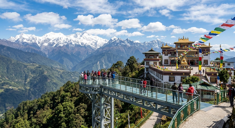 The Pelling Sky Walk is one of Sikkim’s most thrilling attractions, located near the magnificent Chenrezig Statue at an altitude of about 7,200 feet. It is India’s first glass skywalk, offering breathtaking views of the Teesta and Rangit rivers, lush green valleys, and the snow-capped Kanchenjunga range.Visitors can walk on the transparent glass floor, feeling as if they’re floating in the air, with a panoramic view of nature below. The site also features Buddhist prayer flags, stairways of faith, and a massive statue of Chenrezig (Lord Avalokiteshvara), symbolizing compassion.