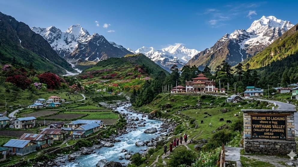 Lachung is a picturesque mountain village in North Sikkim, known for its pristine natural beauty and peaceful atmosphere. Surrounded by snow-covered peaks, waterfalls, and alpine forests, Lachung lies at the confluence of the Lachen and Lachung rivers. It serves as the gateway to the famous Yumthang Valley and Zero Point. Rich in Tibetan culture, Lachung offers traditional hospitality, monasteries, and breathtaking Himalayan landscapes.